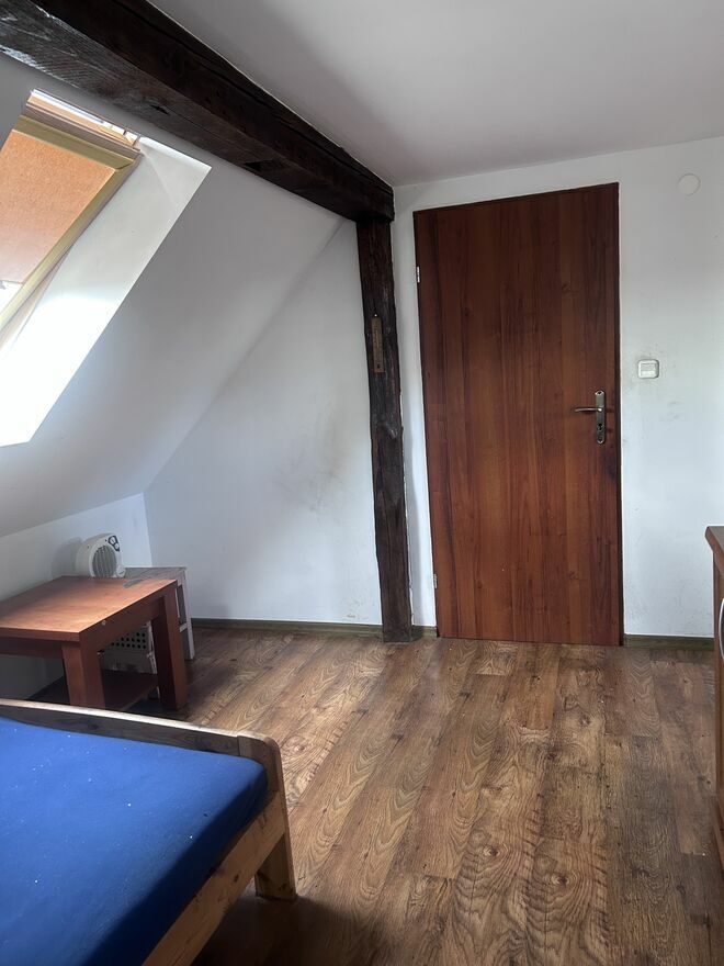 parter: duża kuchnia, łazienka oraz pokój,